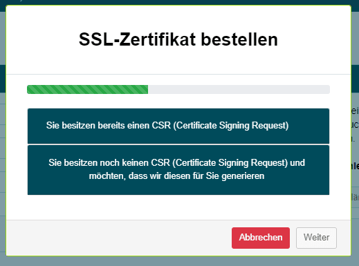 Falls gewünscht, können wir einen CSR für dich erstellen. Wenn du wünschst, dass wir für dich einen CSR erstellen, füge einfach die Domain, die du mit dem Zertifikat verwenden möchtest, in das vorgesehene Feld ein und klicke auf Weiter.