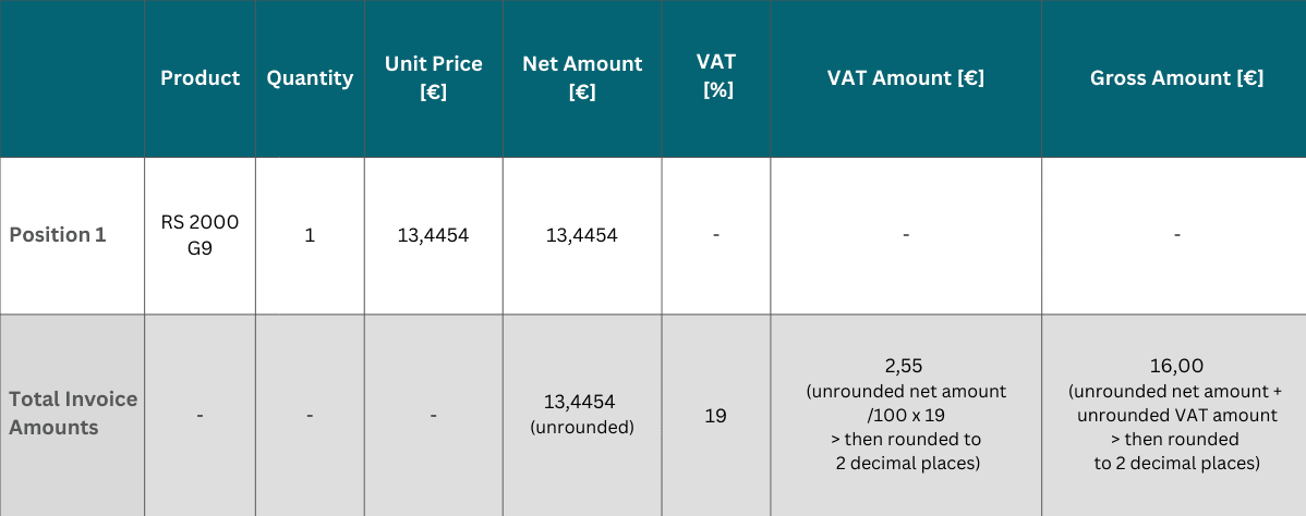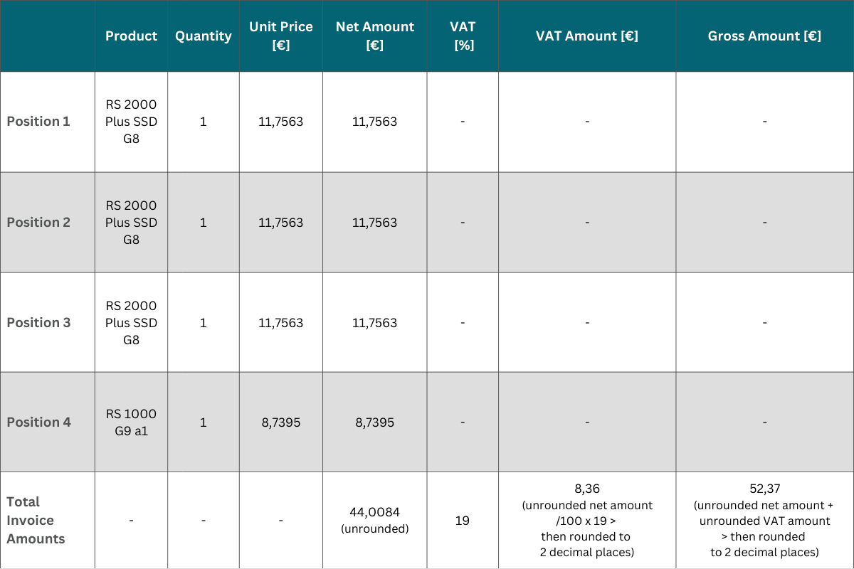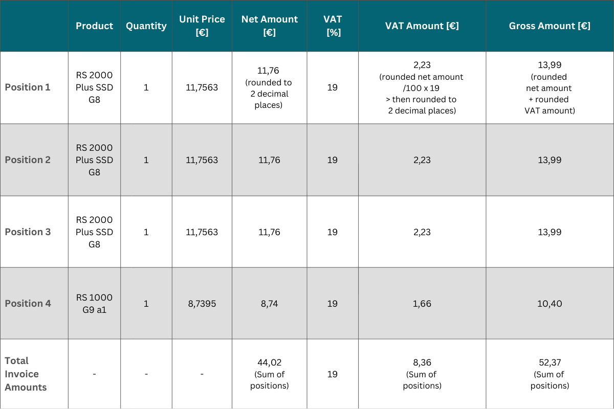 - The final invoice amounts (net, VAT and gross) are calculated by adding the rounded individual values.