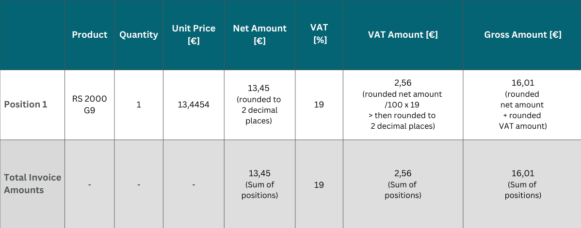 Since each invoice item is now rounded at the position level, a difference of ±1 cent may occur for multiple items in the net, VAT, and gross amounts. The extent of the difference depends primarily on the number of positions.